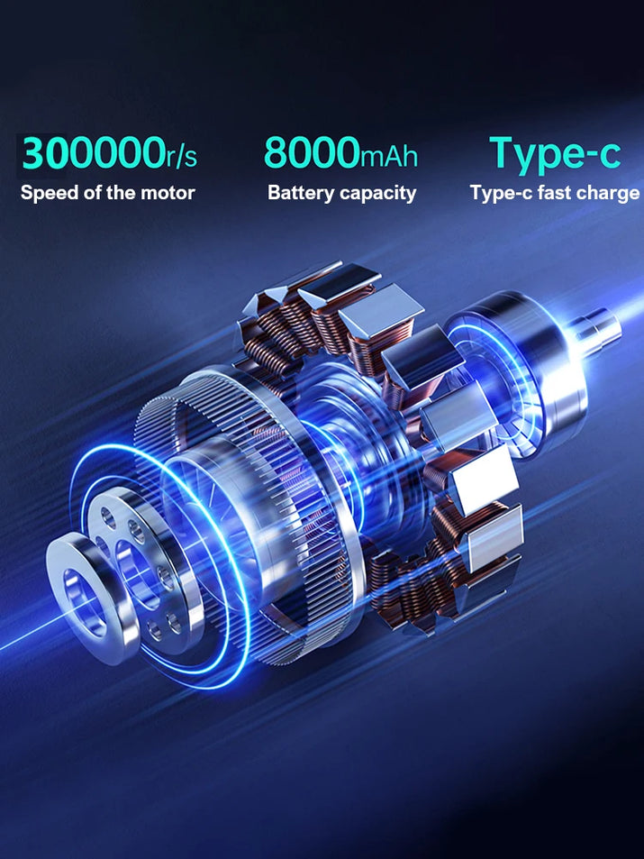 Answer 2: The blower is equipped with a powerful brushless motor and a 300000 RPM turbofan, allowing for strong dust removal across various debris types, including dust, sand, and hair.